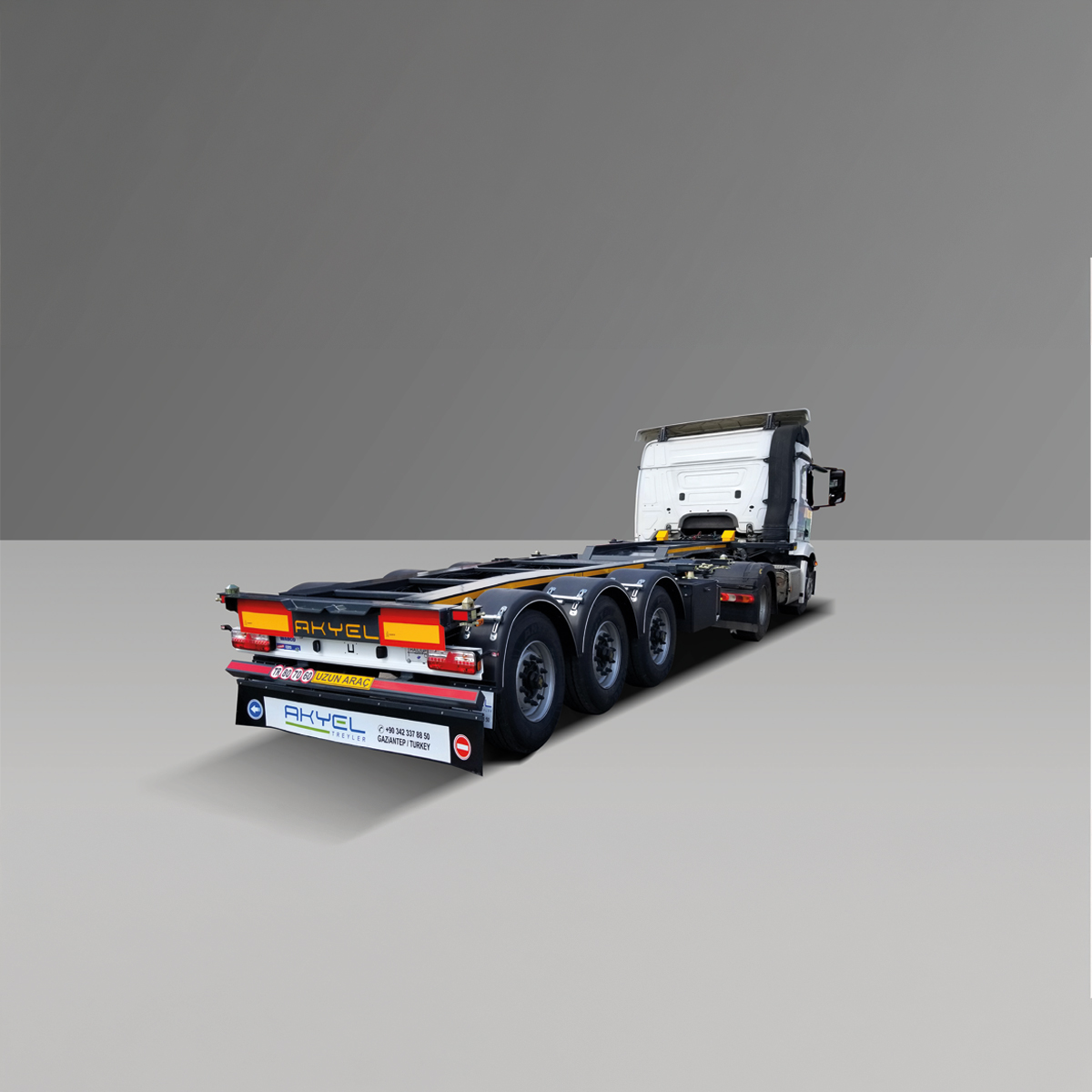 AKYEL TRAILER teleskopik konteyner taşıyıcı treyleri, farklı konteyner ölçülerine hızlı uyum sağlayan yapısıyla liman, depo, lojistik merkezleri ve sahada verimli taşıma çözümü sunar. Dayanıklı şasi yapısı, güvenli yükleme altyapısı ve operasyonel esnekliğiyle yoğun taşımacılık süreçlerinde yüksek performans için tasarlanmıştır.